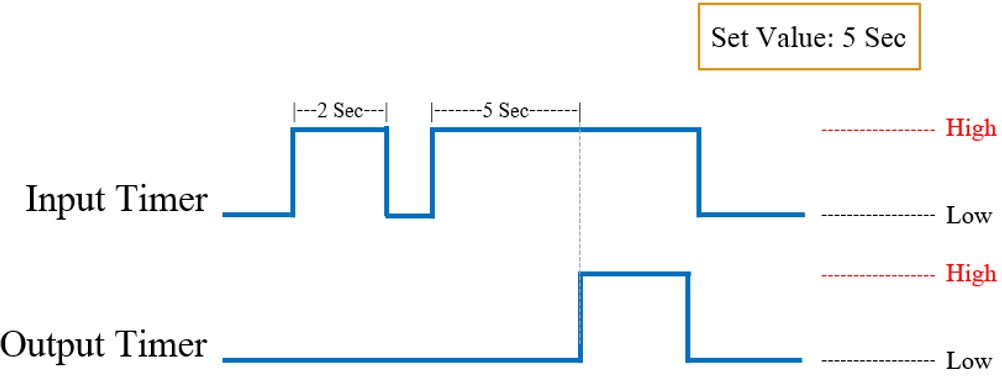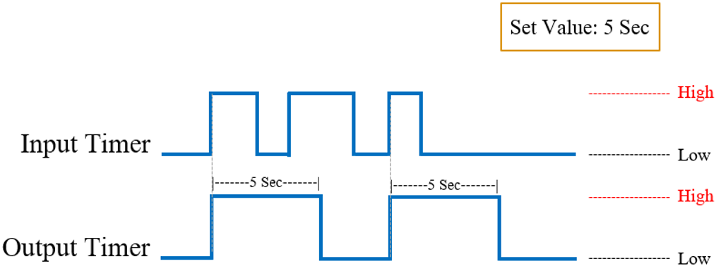 โดยการใช้ Timer นั้นจะทำงานในรูปแบบ On-Delay Timer เป็นการหน่วงเวลาระยะเวลาหนึ่ง โดยมีเงื่อนไขคือ หาก Input เป็น 1 (High) เมื่อครบตามระยะเวลาที่กำหนดแล้ว Output ของ Timer จะส่งสัญญาณ 1 (High) ออกมา ซึ่งสามารถนำไปใช้งานต่อได้ขึ้นอยู่กับการใช้งาน เป็นดังนี้