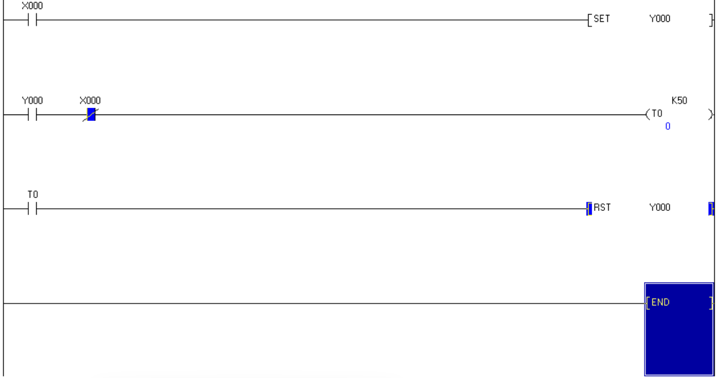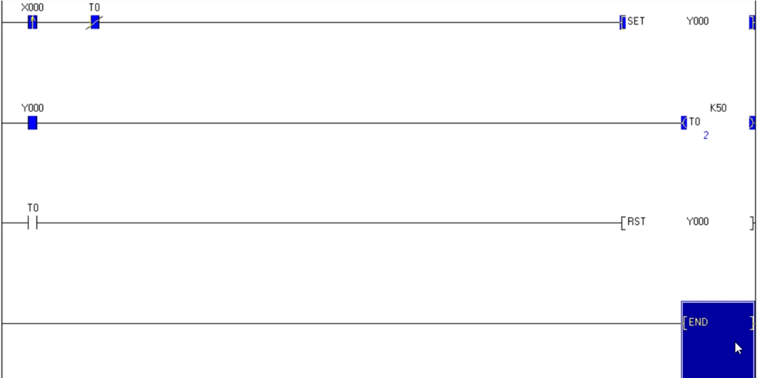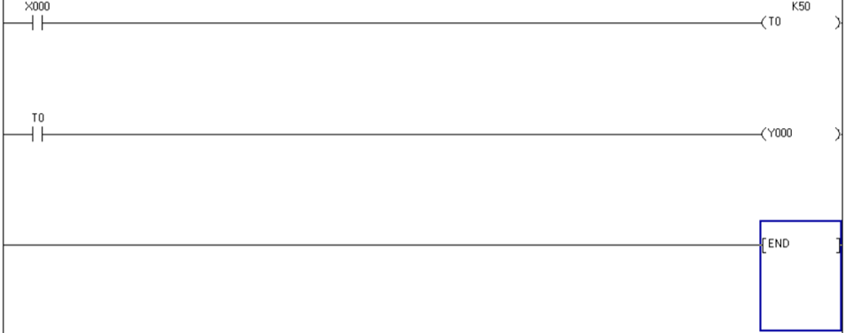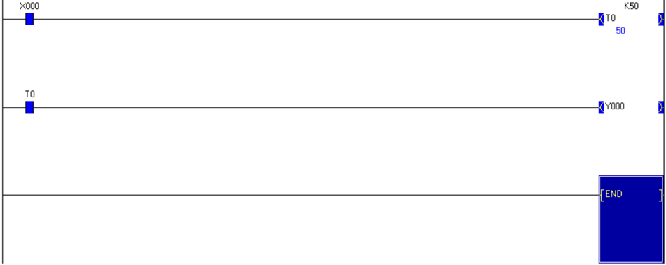 โดยจะใช้ X0 ใช้งานแบบ NO ในการจ่ายไฟให้ Timer ซึ่งจะตั้งเวลาไว้ที่ 5 วินาที ซึ่งในโปรแกรมที่ใช้เขียนนั้นจะกำหนดเป็น K50 (K1 = 0.1 วินาที) เนื่องจาก Timer ที่ใช้แต่ละตำแหน่งมีวิธีการกำหนดระยะเวลาที่แตกต่างกันออกไป ลักษณะการใช้งานเป็นดังนี้