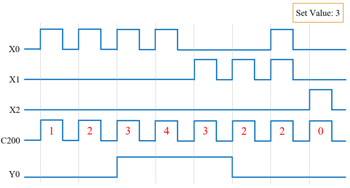 โดยจะกำหนดให้ X0 เป็นการเพิ่มจำนวน, X1 เป็นการลดจำนวน, X2 เป็นการรีเซ็ตค่า, C200 เป็น Address ของ Counter ที่สามารถใช้งานแบบเพิ่มลดจำนวนได้ และ Y0 เป็นตัวรับค่า Output จาก Counter ซึ่งในวงจรที่ออกแบบไว้นั้นจะมีการใช้ Interlock ระหว่าง X0 กับ X1 เพื่อไม่ให้ทำงานพร้อมกัน แล้วใช้ X1 สั่งให้ M8200 ทำงานเพื่อไปเปิดใช้งาน Counter down ลักษณะการใช้งานเป็นดังนี้